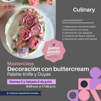 La Masterclass con Romina Heredia: Decoración con Buttercream - Palette Knife & Duyas ✨, es una experiencia de dos días para dominar el arte floral en pastelería.
